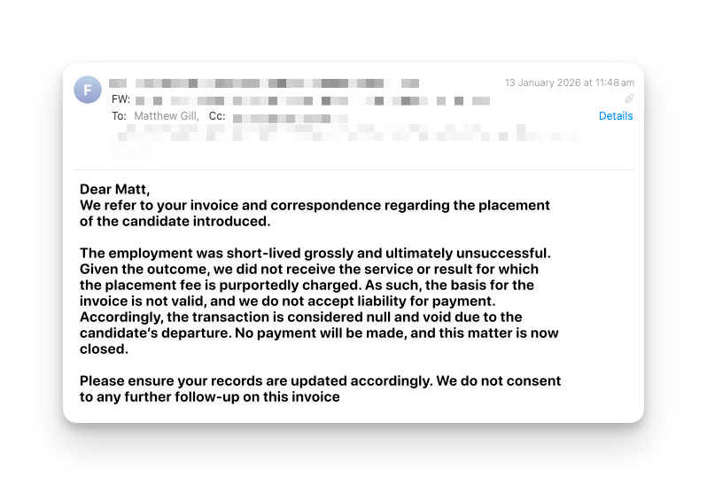 “You supplied a dud candidate…” (despite being hired for months without issues)